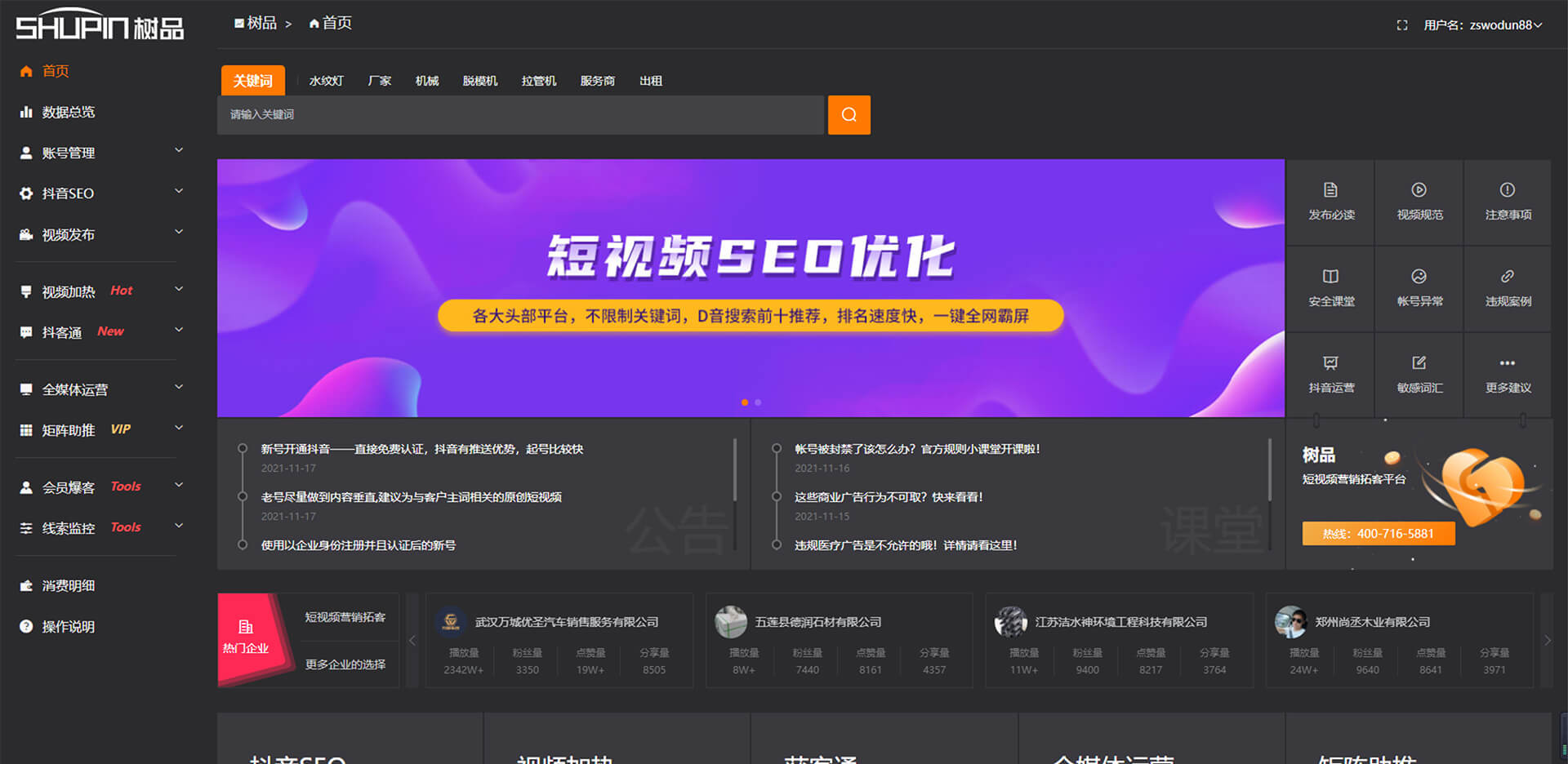幫助企業(yè)解決在短視頻營銷中的內(nèi)容生產(chǎn)、賬號搭建、賬號運(yùn)營 、精準(zhǔn)低成本引流、業(yè)務(wù)場景、服務(wù)場景、服務(wù)效率等問題的短視頻營銷拓客平臺。